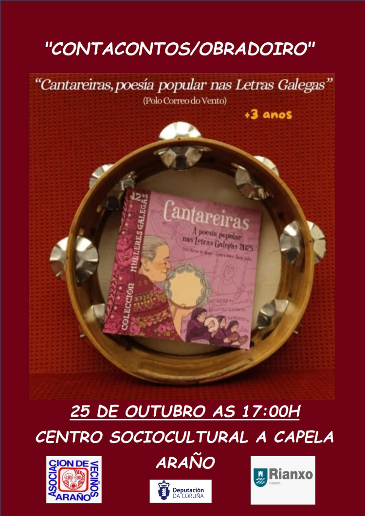 Contacontos/Obradoiro, Cantareiras, poesía popular nas Letras Galegas a cargo de Polo Correo do Vento DÍA: sábado 25 de outubro HORA: 17.00 h LUGAR: centro sociocultural da Capela (Araño) DURACIÓN: 60 minutos PÚBLICO DESTINATARIO: a partir de 3 anos Organizado polo Concello de Rianxo co apoio da Deputación da Coruña. Será unha actividade de contacontos ilustrado na que se mestura a oralidade, ilustración e...