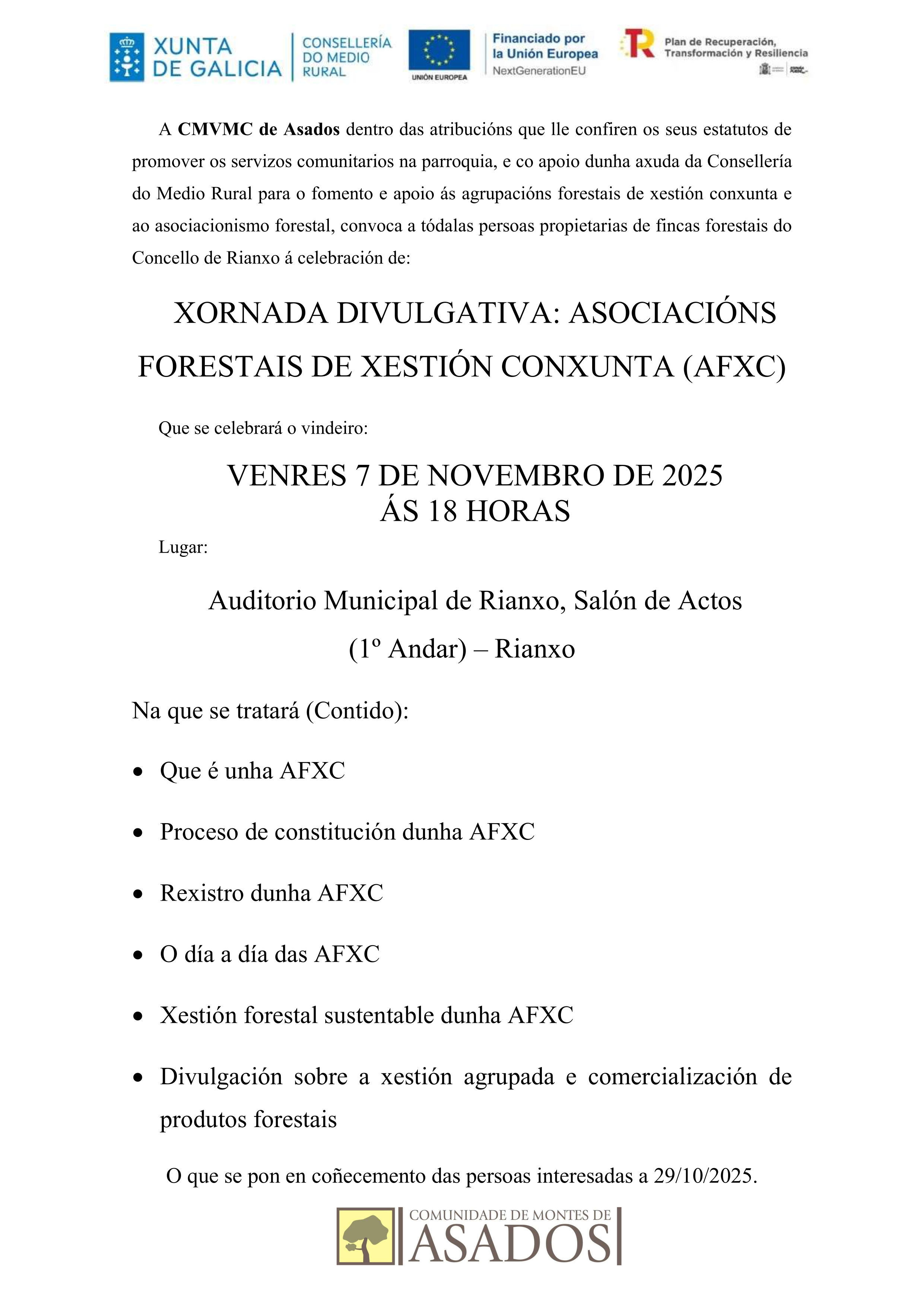 Xornada divulgativa: asociacións forestais de xestión conxunta (AFXC), organizada pola Comunidade de Montes de Asados. DÍA: venres 07 de novembro HORA: 18.00 horas LUGAR: Centro Sociocultural/Auditorio de Rianxo (Salón de actos - primeiro andar)