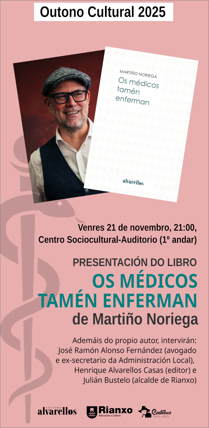 LIBROS, Os médicos tamén enferman de Martiño Noriega editado por Alvarellos Editora. DÍA: venres 21 de novembro HORA: 21:00 h LUGAR: salón de actos do Centro sociocultural-Auditorio de Rianxo (primeiro andar) Doce anos despois de exercer como alcalde, primeiro no Concello de Teo, e despois en Santiago de Compostela, Martiño Noriega regresou á súa profesión, a Medicina. Os médicos tamén enferman é unha crónica persoal onde Noriega relata...