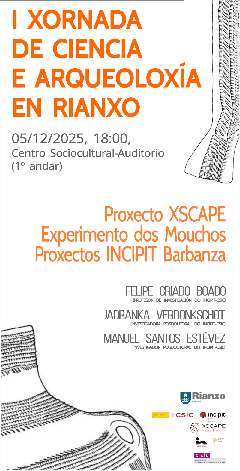I Xornada de ciencia e arqueoloxía en Rianxo organizada polo Concello de Rianxo que tratará arredor do Proxecto XSCAPE, do Experimento dos Mouchos e dos Proxectos INCIPIT Barbanza. Intervirán Felipe Criado-Boado (PROFESOR DE INVESTIGACIÓN DO INCIPIT-CSIC), Jadranka Verdonkschot (INVESTIGADORA POSDOUTORAL DO INCIPIT-CSIC) e Manuel Santos-Estévez (INVESTIGADOR POSDOUTORAL DO INCIPIT-CSIC). DÍA: venres 05 de decembro HORA: 18:00...