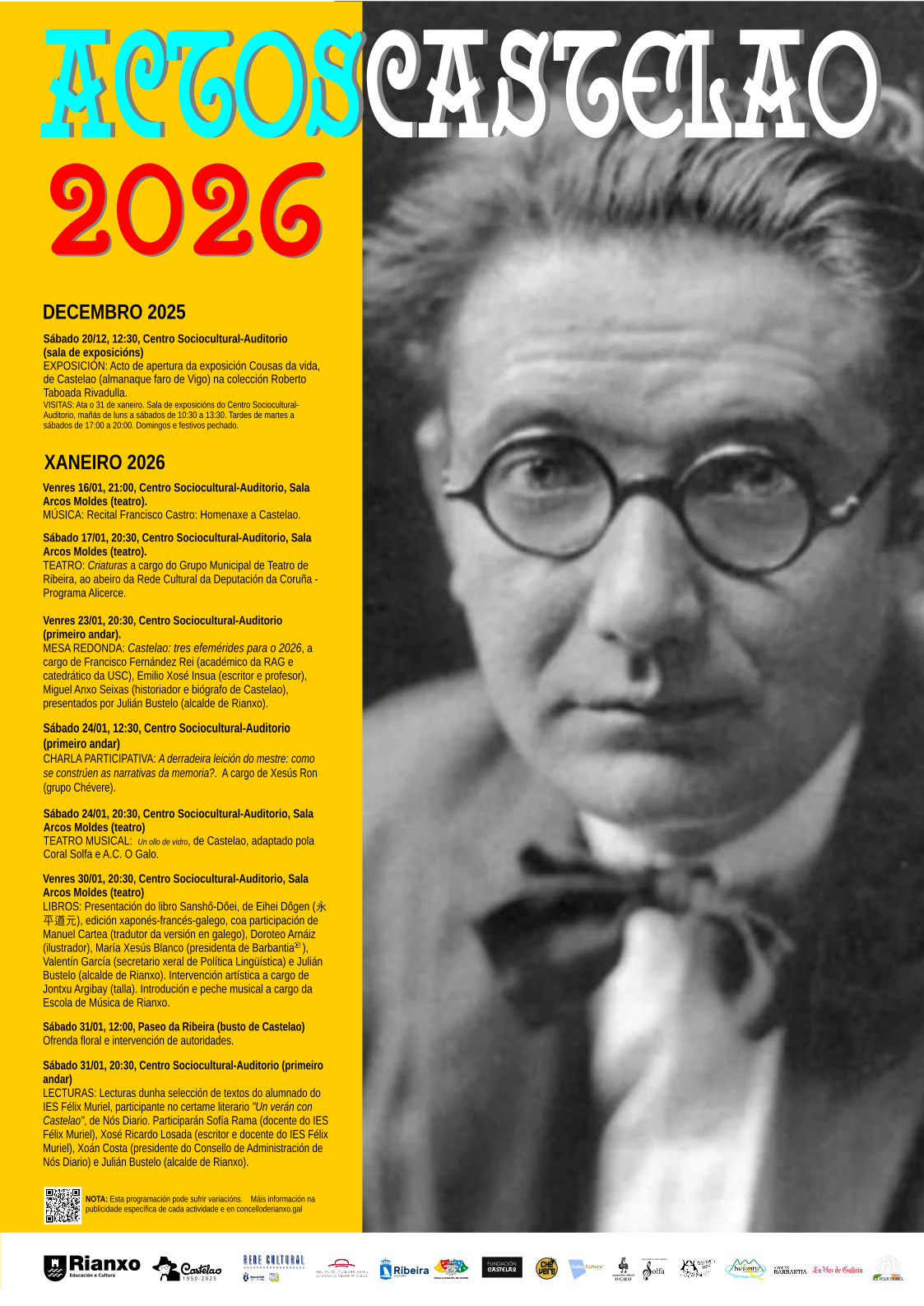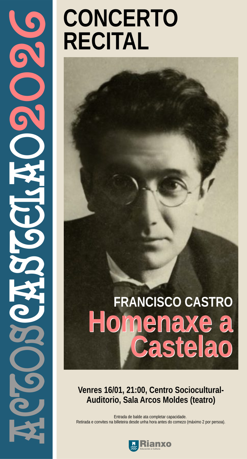Actos Castelao 2026. MÚSICA: Recital Francisco Castro: Homenaxe a Castelao. DÍA: Venres 16 de xaneiro HORA: 21.00 h LUGAR: sala Arcos Moldes do Auditorio de Rianxo ENTRADA: de balde ata completar capacidade. Retirada de convites dende unha hora antes do comezo do concerto na billeteira do auditorio (máximo 2 por persoa)