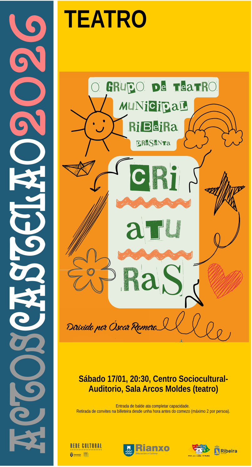 Actos Castelao 2026. TEATRO: Criaturas a cargo do grupo de Teatro Municipal de Ribeira. DÍA: sábado 17 de xaneiro HORA: 20.30 h LUGAR: sala Arcos Moldes do Auditorio de Rianxo ENTRADA: de balde ata completar capacidade. Retirada de convites dende unha hora antes do comezo do concerto na billeteira do auditorio (máximo 2 por persoa)