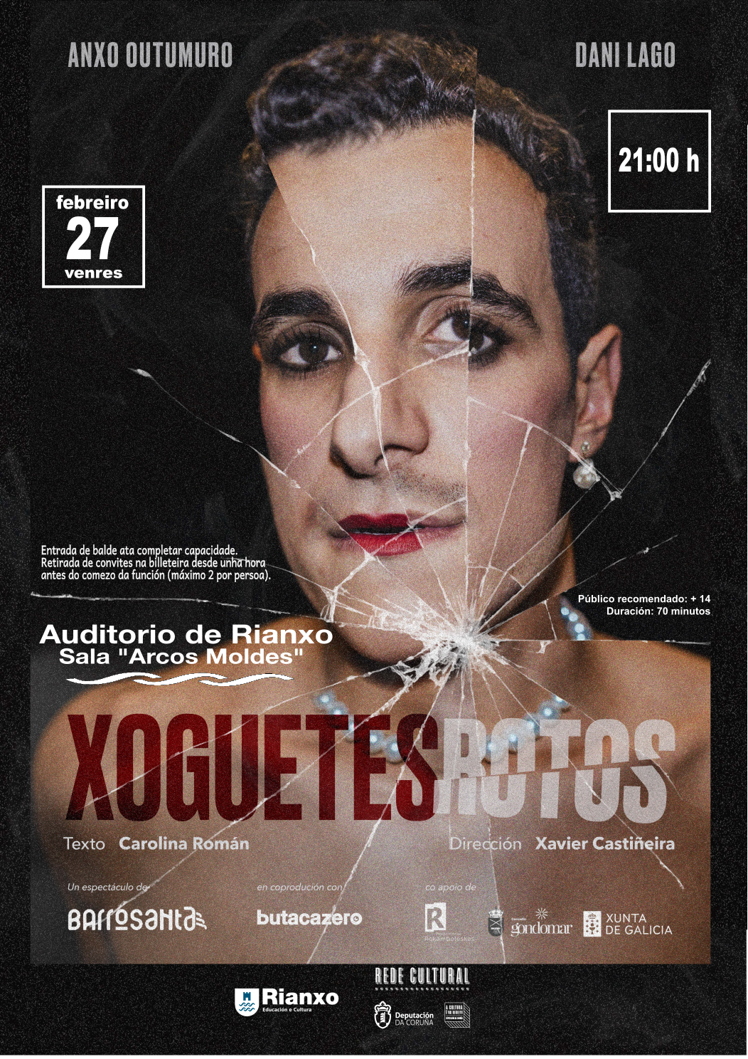 Teatro, Xoguetes rotos a cargo de Barrosanta en coprodución con Butacazero. DÍA: venres 27 de febreiro HORA: 21:00 LUGAR: sala Arcos Moldes do Auditorio PÚBLICO RECOMENDADO: maiores de 14 anos DURACIÓN: 70 minutos ENTRADA: de balde ata completar capacidade. Recollida de convites dende unha hora antes do comezo da función (máximo 2 por persoa) Organizado polo Concello de Rianxo ao abeiro da programación da...