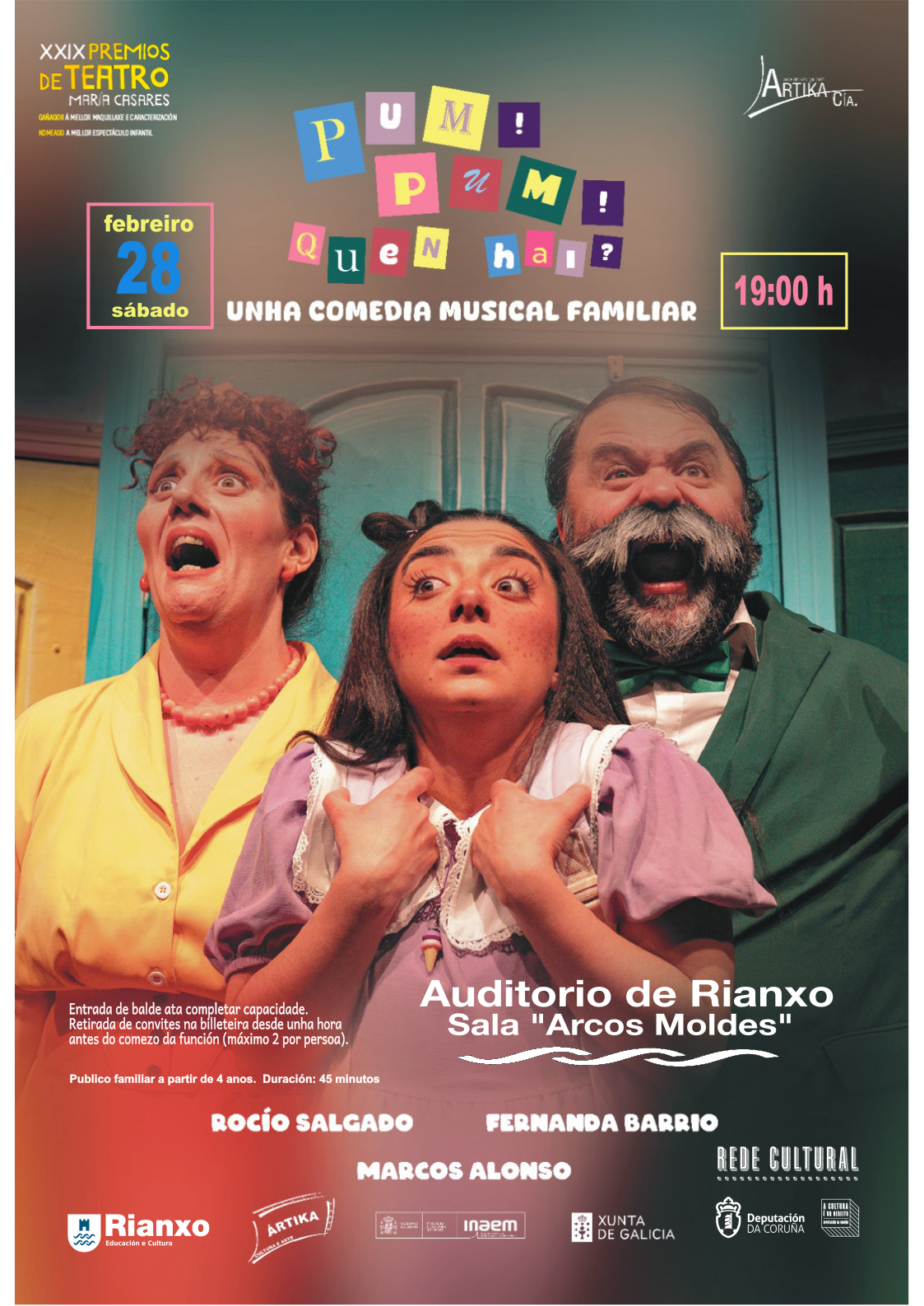 Comedia musical, Pum! Pum! Quen hai? a cargo de Ártica Compañía. DÍA: sábado 28 de febreiro HORA: 19:00 LUGAR: sala Arcos Moldes do Auditorio PÚBLICO RECOMENDADO: maiores de 4 anos DURACIÓN: 45 minutos ENTRADA: de balde ata completar capacidade. Recollida de convites dende unha hora antes do comezo da función (máximo 2 por persoa) Organizado polo Concello de Rianxo ao abeiro da programación da Rede...