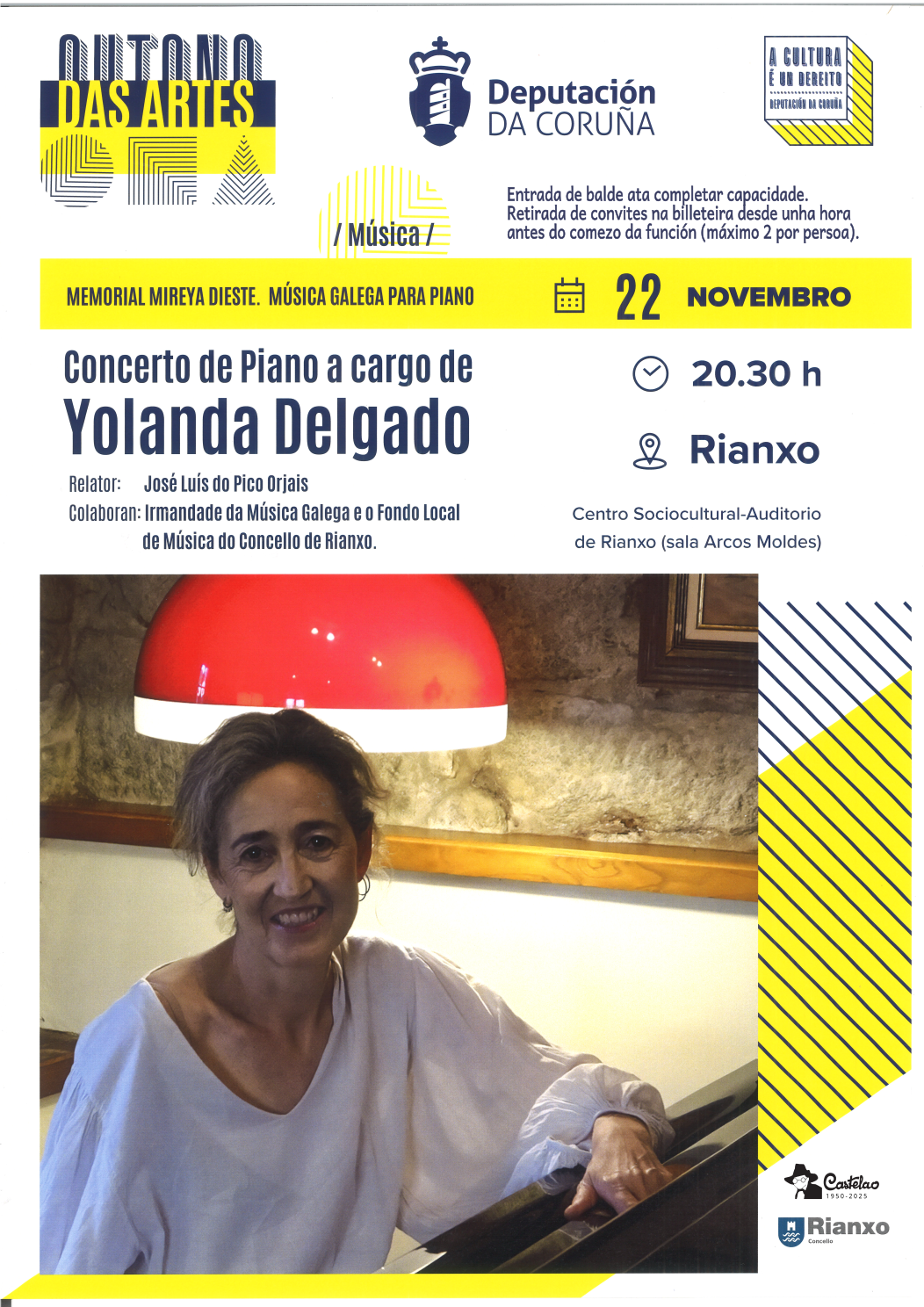 Memorial Mireya Dieste, concerto de piano de Yolanda Delgado. Relator: José Luís do Pico Orjais. Concerto organizado pola Irmandade da Música Galega e o Fondo Local de Música do Concello de Rianxo e enmarcado no programa Outono das Artes da Deputación de Coruña DÍA: sábado 22 de novembro HORA: 20.30 h LUGAR: sala Arcos Moldes do Auditorio de Rianxo PÚBLICO DESTINATARIO: todos os públicos ENTRADA: de balde ata completar capacidade...