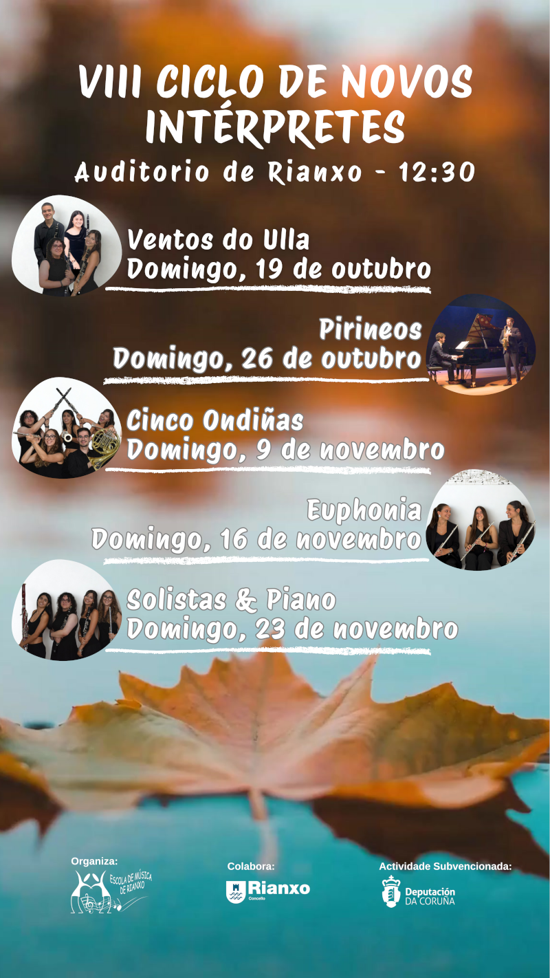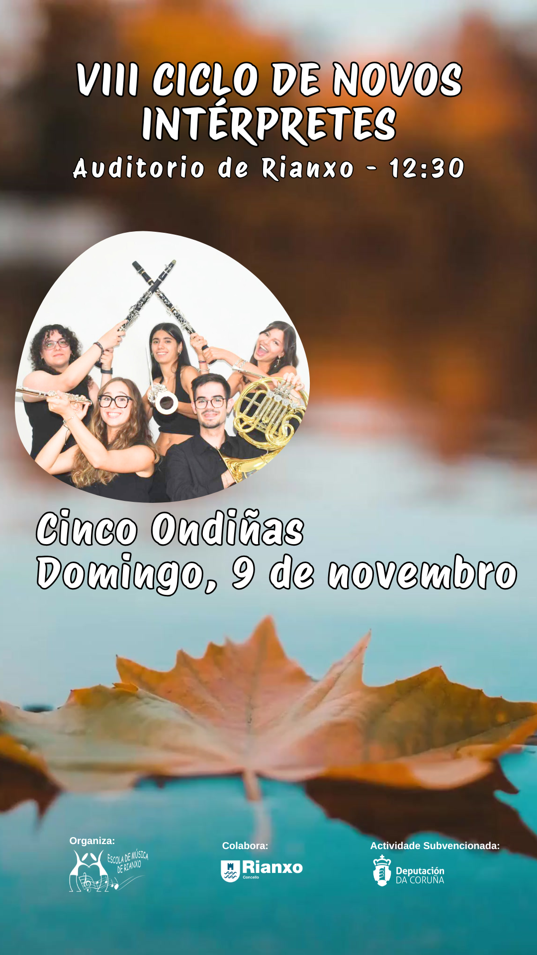 Música, Concerto da agrupación Cinco ondiñas (quinteto de vento) no VIII Ciclo de Novos Intérpretes organizado pola Escola de Música de Rianxo e o Concello de Rianxo. Cinco ondiñas (quinteto de vento) DÍA: domingo 09 de novembro HORA: 12.30 h LUGAR: sala Arcos Moldes do Auditorio de Rianxo ENTRADA: de balde ata completar capacidade do espazo Próximos concertos do ciclo: ...