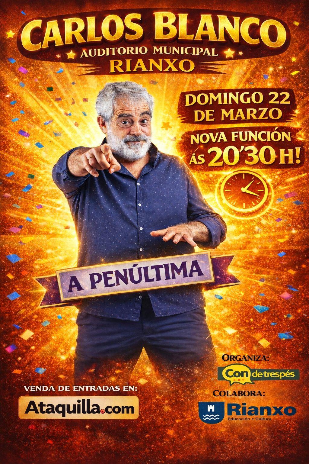 Unha nova función ás 20:30 horas, xa podes adquirir as túas entradas en ataquilla A penúltima de Carlos Blanco DÍA: domingo 22 de marzo HORA: 18:30 - 20.30 h LUGAR: sala Arcos Moldes do Auditorio DURACIÓN: 70 minutos ENTRADA: 16.20 € á venda en