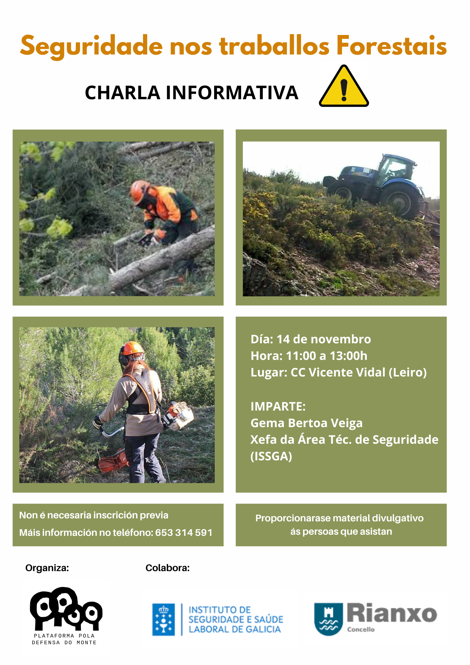 Charla informativa, Seguridade nos traballos forestais. DÍA: sábado 14 de novembro HORA: de 11.00 a 13.00 horas LUGAR: Centro Cultural Vicente Vidal de Leiro