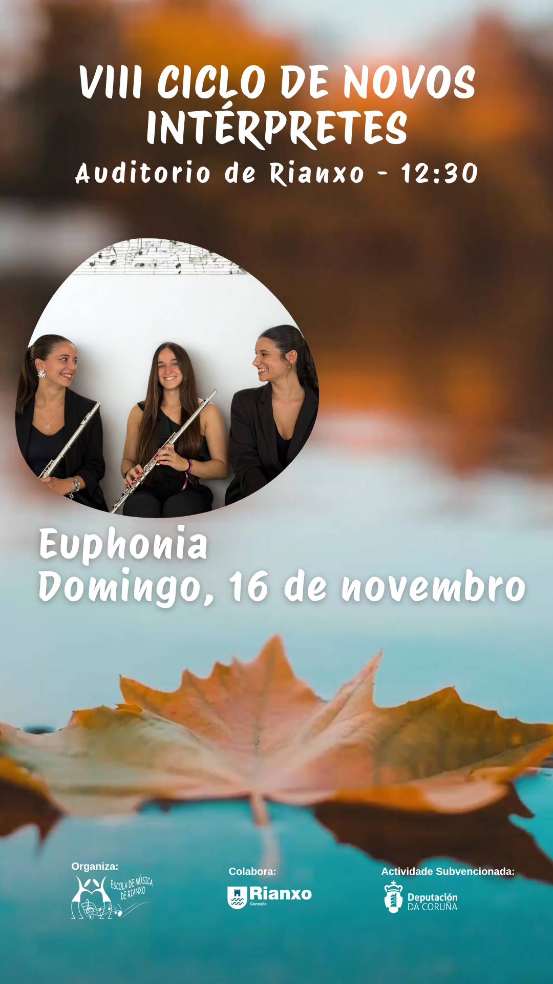 Música, Concerto da agrupación Euphonia (trío de frautas) no VIII Ciclo de Novos Intérpretes organizado pola Escola de Música de Rianxo e o Concello de Rianxo. DÍA: domingo 16 de novembro HORA: 12.30 h LUGAR: sala Arcos Moldes do Auditorio de Rianxo ENTRADA: de balde ata completar capacidade do espazo Próximos concertos do ciclo: Solistas & piano (piano e ventos) DÍA: domingo 23 de...