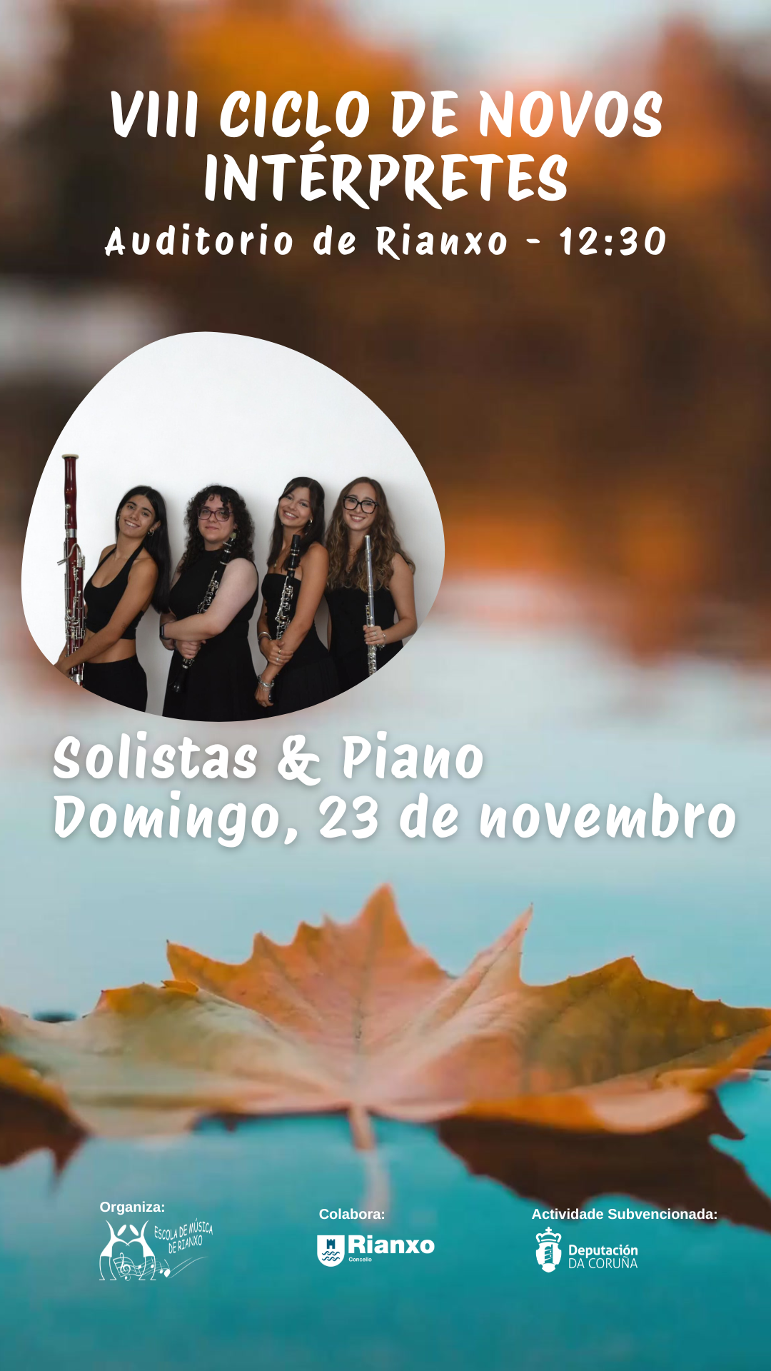 Música, Concerto da agrupación Solistas & piano (piano e ventos) no VIII Ciclo de Novos Intérpretes organizado pola Escola de Música de Rianxo e o Concello de Rianxo. DÍA: domingo 23 de novembro HORA: 12.30 h LUGAR: sala Arcos Moldes do Auditorio de Rianxo ENTRADA: de balde ata completar capacidade do espazo