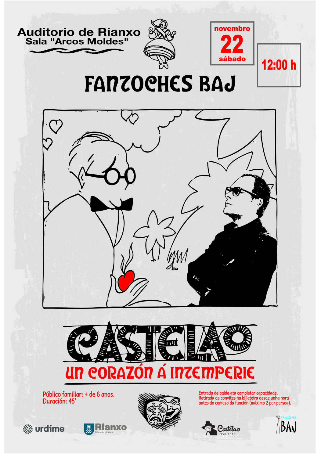 Teatro; Castelao, un corazón á intemperie por Fantoches Baj. DÍA: sábado 22 de novembro HORA: 12:00 h LUGAR: sala Arcos Moldes do Auditorio de Rianxo PÚBLICO DESTINATARIO: familiar, para crianzas a partir de 6 anos DURACIÓN: 45 minutos ENTRADA: de balde ata completar capacidade do espazo. Retirada de convites, dende unha hora antes do comezo da función na billeteira do auditorio (máximo 2 por persoa) SITIO WEB DO...