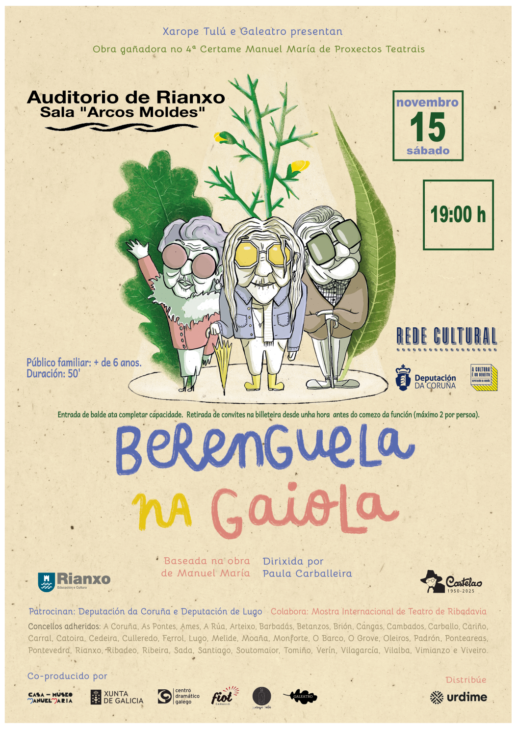 Teatro, Berenguela na gaiola por Xarope Tulú e Galeatro DÍA: sábado 15 de novembro HORA: 19:00 h LUGAR: sala Arcos Moldes do Auditorio de Rianxo PÚBLICO DESTINATARIO: familiar, para crianzas a partir de 6 anos DURACIÓN: 50 minutos ENTRADA: de balde ata completar capacidade do espazo. Retirada de convites, dende unha hora antes do comezo da función na billeteira do auditorio (máximo 2 por persoa) SITIO WEB DO...