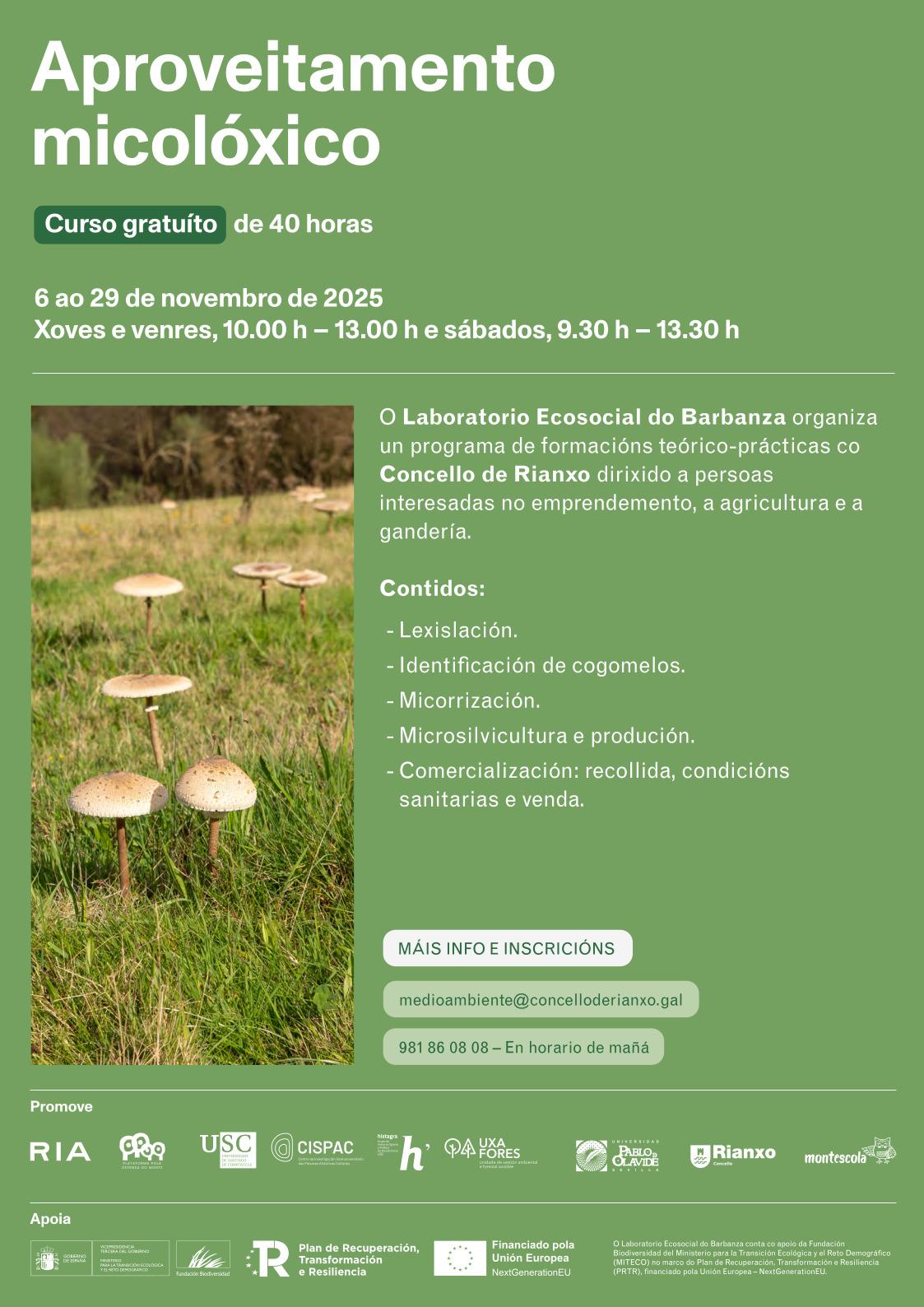O Laboratorio Ecosocial do Barbanza organiza un programa de formacións teórico-prácticas co Concello de Rianxo dirixido a persoas interesadas no emprendemento, a agricultura e a gandería. Contidos: - Lexislación. - Identificación de cogomelos. - Micorrización. - Microsilvicultura e produción. - Comercialización: recollida, condicións sanitarias e venda. 6 ao 29 de novembro de 2025 Xoves e venres, 10.00 h – 13.00 h e sábados, 9.30 h – 13.30...