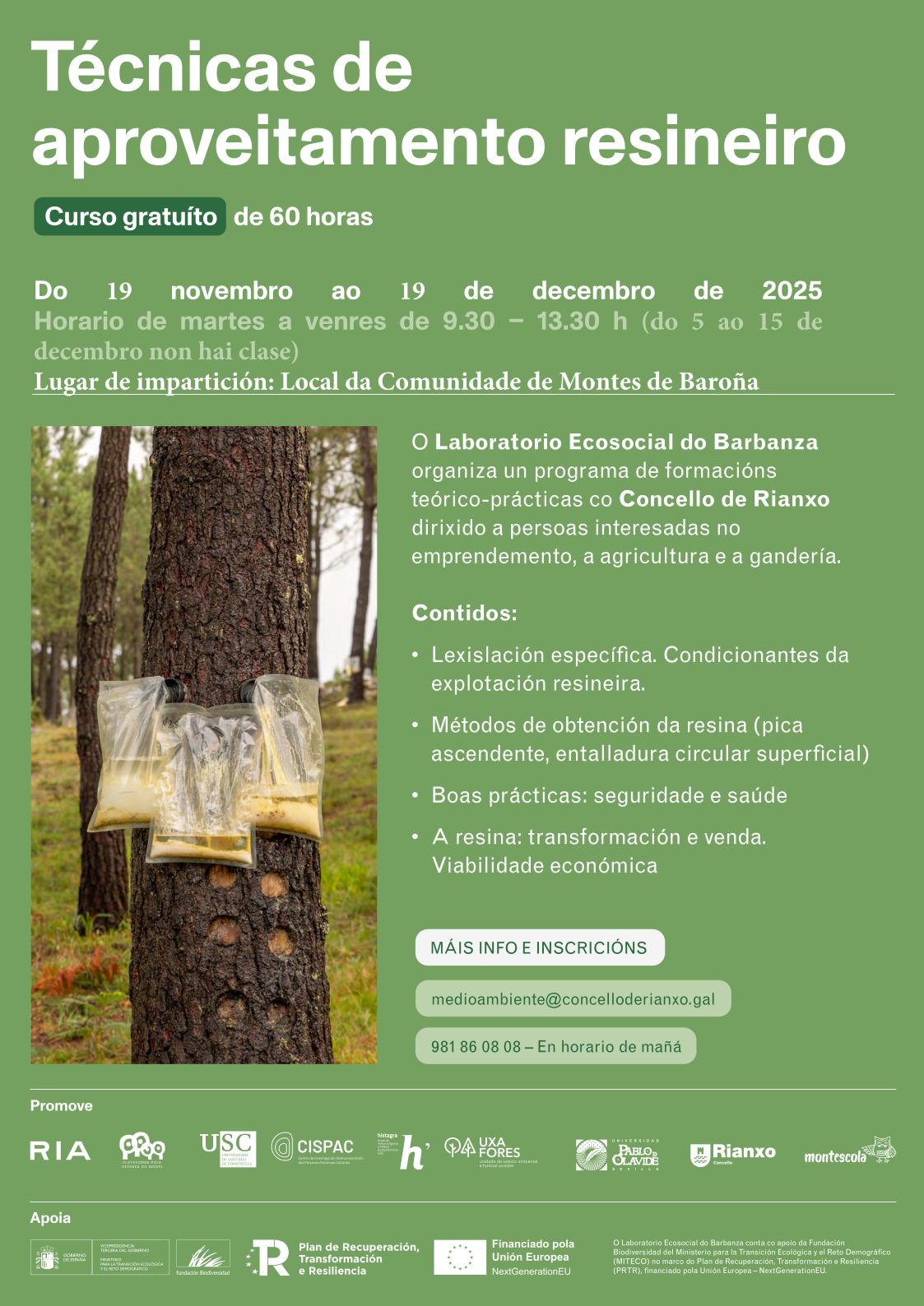 O Laboratorio Ecosocial do Barbanza organiza un programa de formacións teórico-prácticas co Concello de Rianxo dirixido a persoas interesadas no emprendemento, a agricultura e a gandería. Contidos: • Lexislación específica. Condicionantes da explotación resineira. • Métodos de obtención da resina (pica ascendente, entalladura circular superficial) • Boas prácticas: seguridade e saúde • A resina: transformación e venda. Viabilidade económica Do 19...