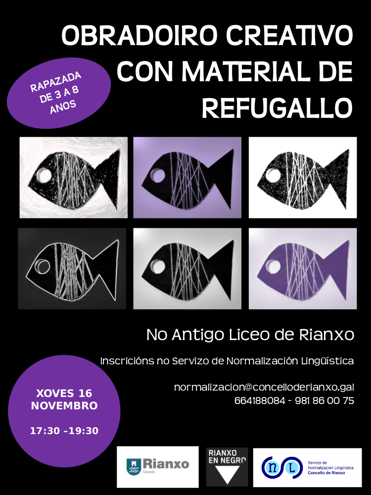 Pero entre as primeiras accións tamén se vai desenvolver un OBRADOIRO CREATIVO CON MATERIAL DE REFUGALLO, destinado á rapazada de 3 a 8 anos, que aprenderá e realizará diferentes motivos que van servir para denunciar e rexeitar a violencia de xénero dende as súas casas, mais tamén para adornar os establecementos comerciais rianxeiros.