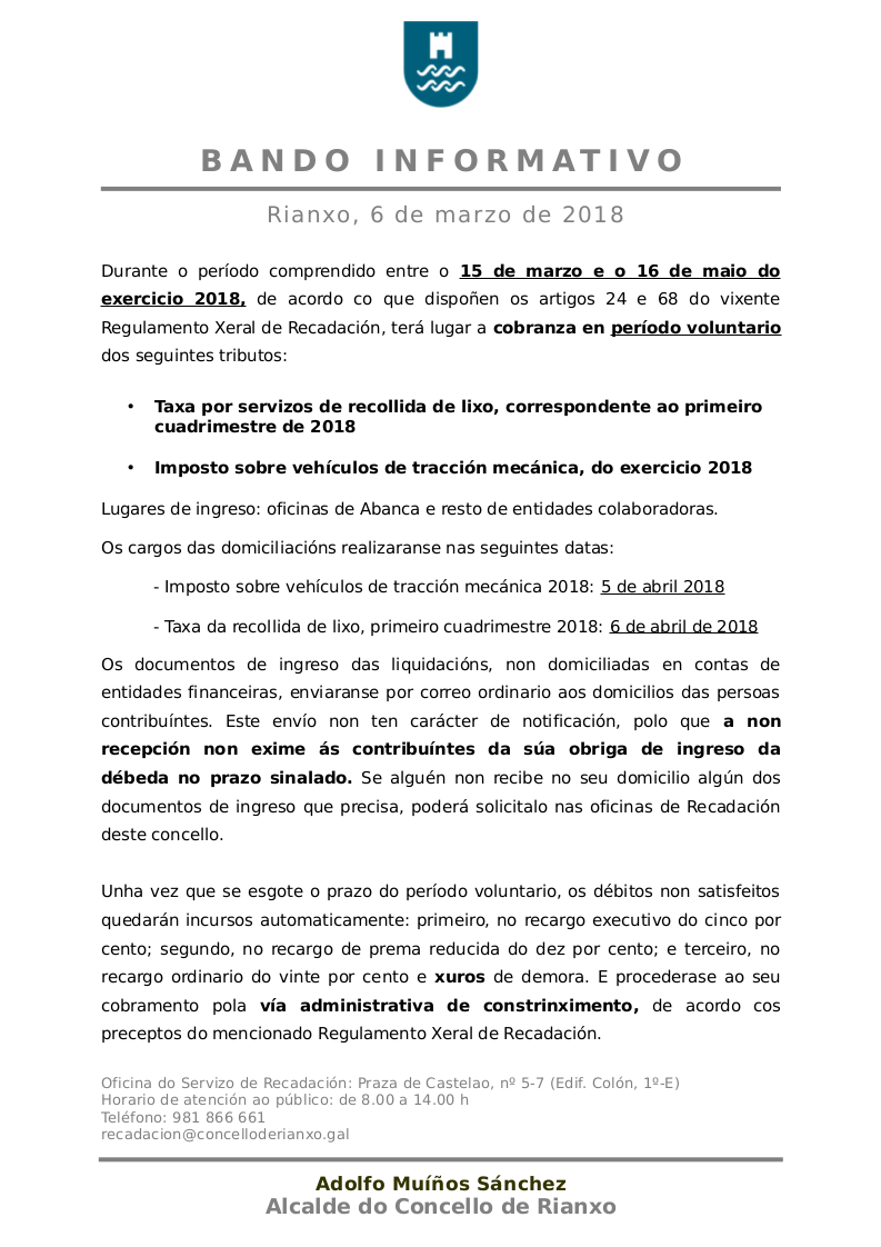 Durante o período comprendido entre o 15 de marzo e o 16 de maio do exercicio 2018, de acordo co que dispoñen os artigos 24 e 68 do vixente Regulamento Xeral de Recadación, terá lugar a cobranza en período voluntario dos seguintes tributos: