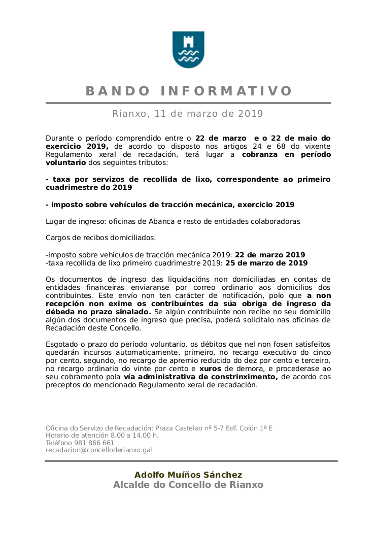 Durante o período comprendido entre o 22 de marzo e o 22 de maio do exercicio 2019, de acordo co disposto nos artigos 24 e 68 do vixente Regulamento xeral de recadación, terá lugar a cobranza en período voluntario dos seguintes tributos: