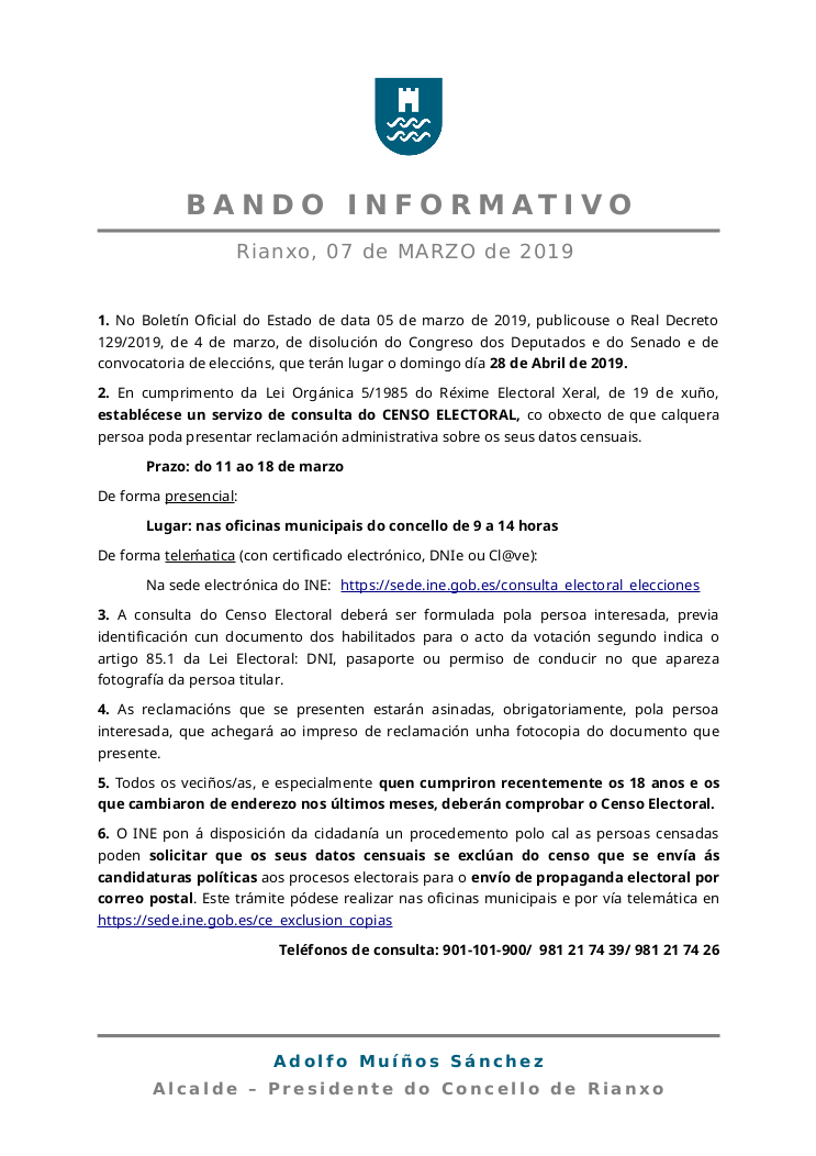 En cumprimento da Lei Orgánica 5/1985 do Réxime Electoral Xeral, de 19 de xuño, establécese un servizo de consulta do CENSO ELECTORAL, co obxecto de que calquera persoa poda presentar reclamación administrativa sobre os seus datos censuais. Prazo: do 11 ao 18 de marzo