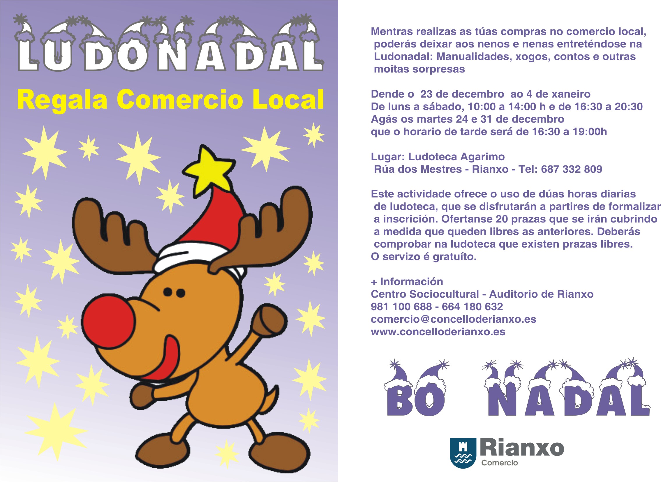 Mentras realizas as túas compras, poderás deixar aos nenos e nenas entreténdose na Ludonadal, onde realizarán manualidades, contos, xogos e moitas outras sorpresas. A actividade desenvolveráse os días 23,24, 26, 27, 28, 30 e 31 de decembro e o 2, 3 e 4 de xaneiro en horario de 10:00 a 14:00 horas e de 16:30 a 20:30 (agás o 24 e 31 que pechará as 19:00), e está dirixira a nenos e nenas de 3 a 12 anos. O lugar onde se desenvolveran as actividades será a Ludoteca Agarimo, situada na Rúa dos Mestres (Rianxo).