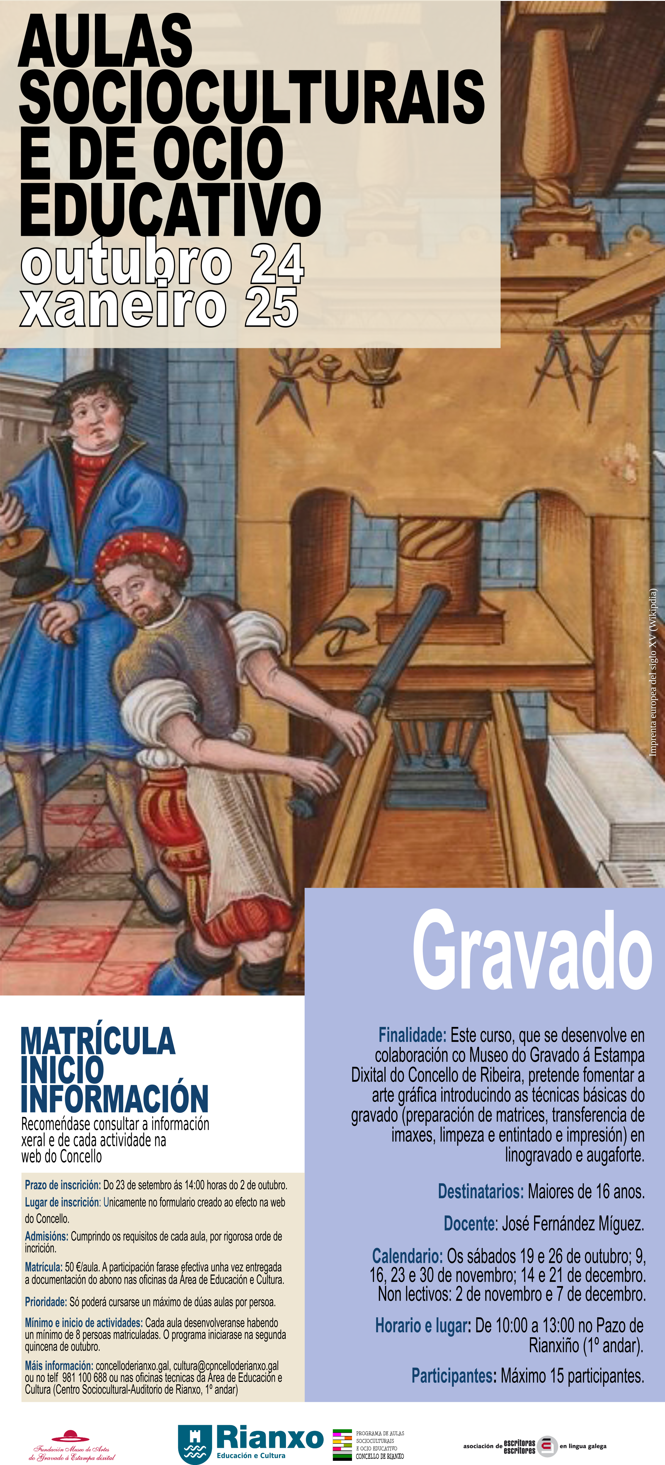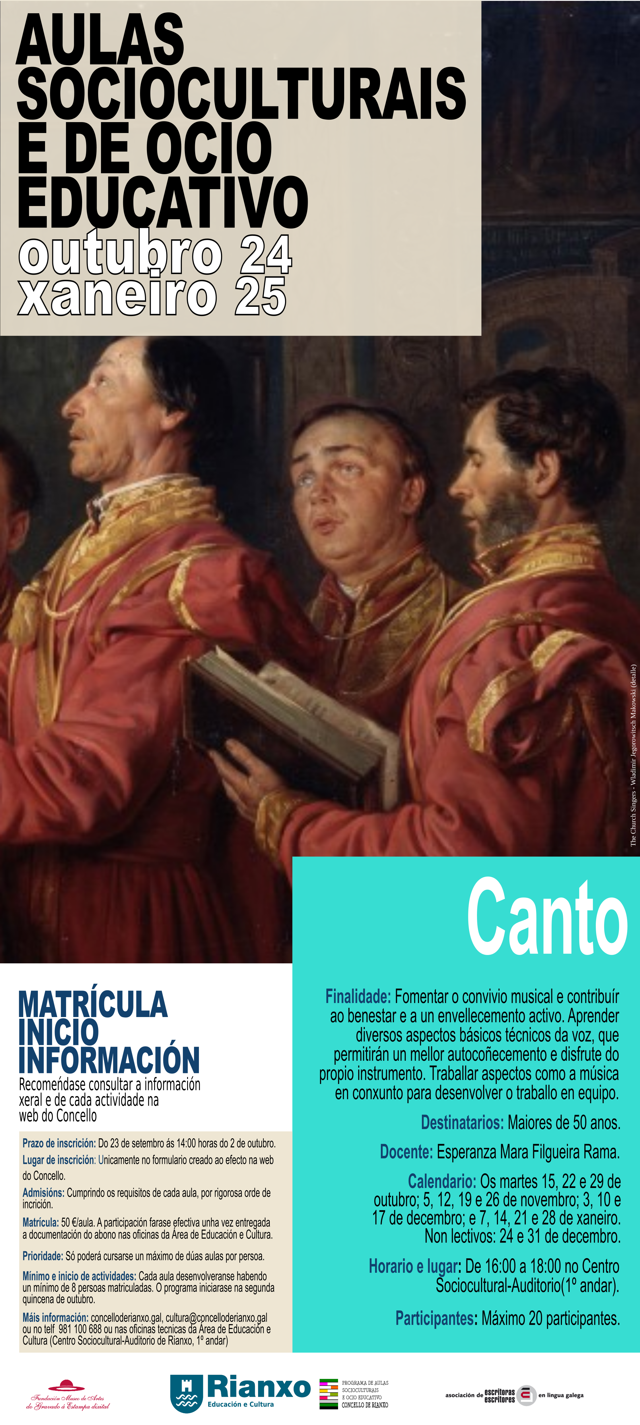 Máis información: concelloderianxo.gal, cultura@concelloderianxo.gal ou no telf 981 100 688 ou nas oficinas técnicas da Área de Educación e Cultura (Centro Sociocultural-Auditorio de Rianxo, 1º andar).