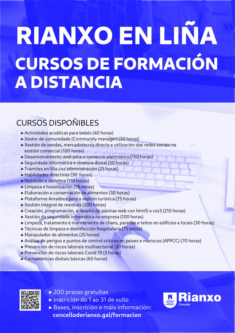 Formalización: As persoas admitidas recibirán no correo electrónico as claves de acceso á plataforma de formación en liña, e disporán de 3 meses para completar os cursos solicitados. Ao finalizar os cursos entregaranse diplomas acreditativos do aproveitamento do curso.