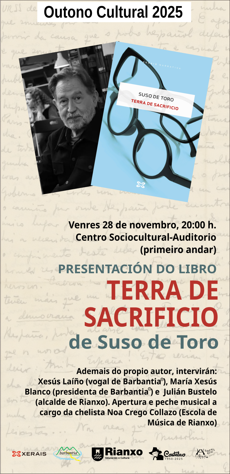 Libros, presentación de Terra de sacrificio de Suso de Toro editado por Xerais. Ademais do propio autor, intervirán: Xesús Laíño (vogal de Barbantia ), María Xesús Blanco (presidenta de Barbantia ) e  Julián Bustelo (alcalde de Rianxo). Apertura e peche musical a cargo da chelista Noa Crego Collazo (Escola de Música de Rianxo). DÍA: venres 28 de novembro HORA: 20:00 h LUGAR: salón de actos do Centro sociocultural-Auditorio de Rianxo...