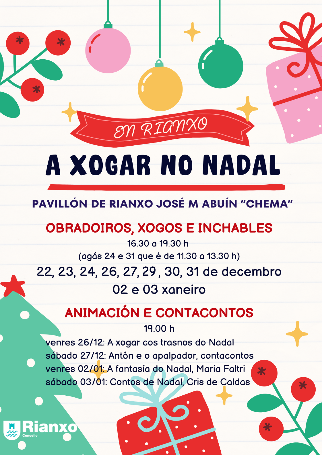 En Rianxo, a xogar no Nadal OBRADOIROS, XOGOS E INCHABLES DÍAS: 22, 23, 24, 26, 27, 29, 30, 31 de decembro e 02 e 03 xaneiro HORA: 16:30-19:30 h agás o 24 e 31 de decembro que será de 11:30-13:30 h LUGAR: Pavillón Polideportivo de Rianxo José M Abuín "Chema" MÚSICA E CONTACONTOS ÁS 19.00 horas venres 26/12: A xogar cos trasnos do Nadal sábado 27/12: Antón e o apalpador, contacontos venres...
